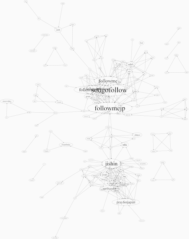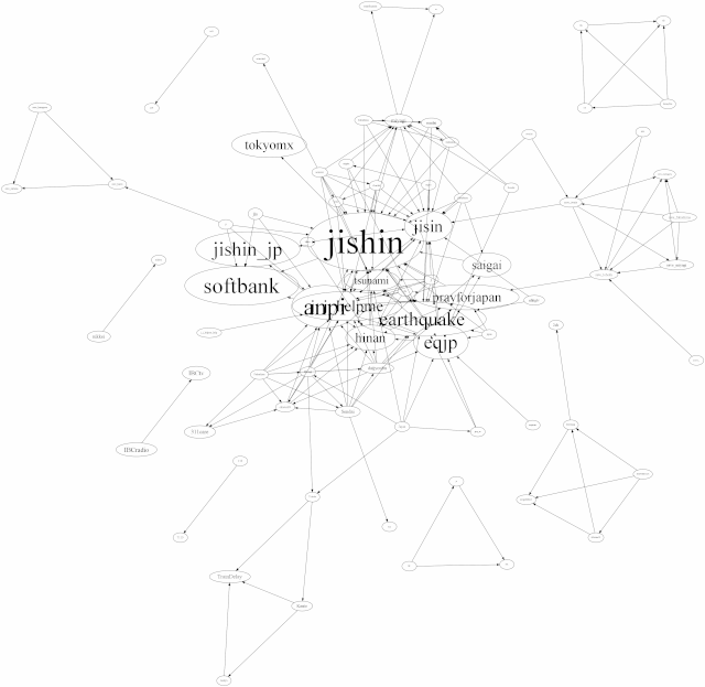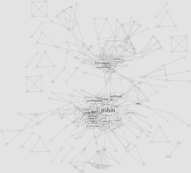 03-11 09 10 11 12 13 14 15 16 17 18 19 20 21 22 23 03-12 00 01 02 03 04 05 06 07 08 09 10 11 12 13 14 15 16 17 18 19 20 21 22 23 03-13 00 01 02 03 04 05 06 07 08 09 10 11 12 13 14 15 16 17 18 19 20 21 22 23 03-14 00 01 02 03 04 05 06 07 08 09 10 11 12 13 14 15 16 17 18 19 20 21 22 23 03-15 00 01 02 03 04 05 06 07 08 09 10 11 12 13 14 15 16 17 18 19 20 21 22 23 03-16 00 01 02 03 04 05 06 07 08 09 10 11 12 13 14 15 16 17 18 19 20 21 22 23 03-17 00 01 02 03 04 05 06 07 08 09 10 11 12 13 14 15 16 17 18 19 20 21 22 23 03-18 00 01 02 03 04 05 06 07 08 | Top > Project 311 > 2011-03-12_052011-03-12_05のハッシュタグの共起ネットワーク*各画像は縮小後の物で、元のサイズの画像にリンクされています。全体UCINET用ネットワークファイルGraphviz用ネットワークファイル ![]() リツイートなしUCINET用ネットワークファイルGraphviz用ネットワークファイル ![]() リツイートのみUCINET用ネットワークファイルGraphviz用ネットワークファイル ![]() |