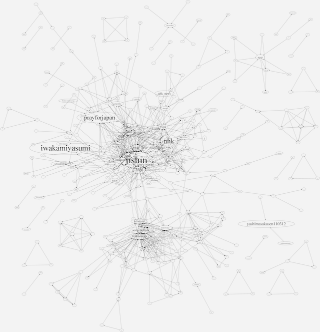 03-11 09 10 11 12 13 14 15 16 17 18 19 20 21 22 23 03-12 00 01 02 03 04 05 06 07 08 09 10 11 12 13 14 15 16 17 18 19 20 21 22 23 03-13 00 01 02 03 04 05 06 07 08 09 10 11 12 13 14 15 16 17 18 19 20 21 22 23 03-14 00 01 02 03 04 05 06 07 08 09 10 11 12 13 14 15 16 17 18 19 20 21 22 23 03-15 00 01 02 03 04 05 06 07 08 09 10 11 12 13 14 15 16 17 18 19 20 21 22 23 03-16 00 01 02 03 04 05 06 07 08 09 10 11 12 13 14 15 16 17 18 19 20 21 22 23 03-17 00 01 02 03 04 05 06 07 08 09 10 11 12 13 14 15 16 17 18 19 20 21 22 23 03-18 00 01 02 03 04 05 06 07 08 | Top > Project 311 > 2011-03-12_202011-03-12_20のハッシュタグの共起ネットワーク*各画像は縮小後の物で、元のサイズの画像にリンクされています。全体UCINET用ネットワークファイルGraphviz用ネットワークファイル ![]() リツイートなしUCINET用ネットワークファイルGraphviz用ネットワークファイル ![]() リツイートのみUCINET用ネットワークファイルGraphviz用ネットワークファイル ![]() |