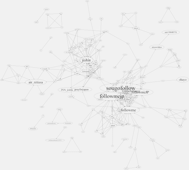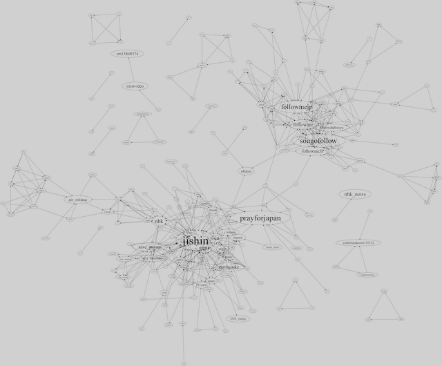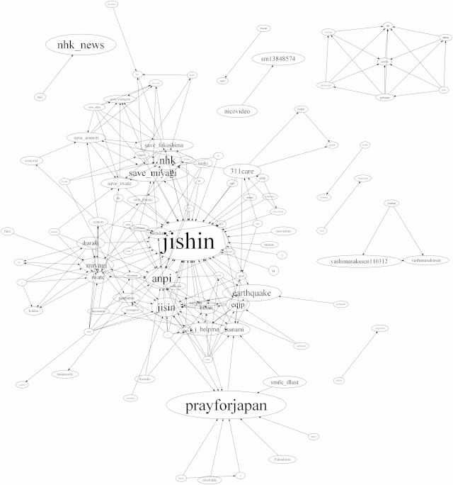 03-11 09 10 11 12 13 14 15 16 17 18 19 20 21 22 23 03-12 00 01 02 03 04 05 06 07 08 09 10 11 12 13 14 15 16 17 18 19 20 21 22 23 03-13 00 01 02 03 04 05 06 07 08 09 10 11 12 13 14 15 16 17 18 19 20 21 22 23 03-14 00 01 02 03 04 05 06 07 08 09 10 11 12 13 14 15 16 17 18 19 20 21 22 23 03-15 00 01 02 03 04 05 06 07 08 09 10 11 12 13 14 15 16 17 18 19 20 21 22 23 03-16 00 01 02 03 04 05 06 07 08 09 10 11 12 13 14 15 16 17 18 19 20 21 22 23 03-17 00 01 02 03 04 05 06 07 08 09 10 11 12 13 14 15 16 17 18 19 20 21 22 23 03-18 00 01 02 03 04 05 06 07 08 | Top > Project 311 > 2011-03-13_072011-03-13_07のハッシュタグの共起ネットワーク*各画像は縮小後の物で、元のサイズの画像にリンクされています。全体UCINET用ネットワークファイルGraphviz用ネットワークファイル ![]() リツイートなしUCINET用ネットワークファイルGraphviz用ネットワークファイル ![]() リツイートのみUCINET用ネットワークファイルGraphviz用ネットワークファイル ![]() |