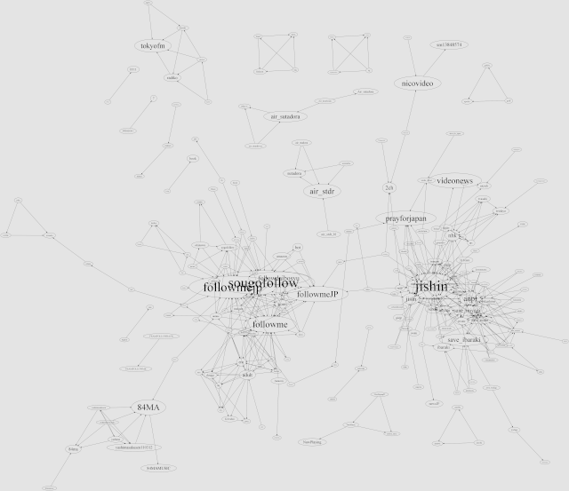 03-11 09 10 11 12 13 14 15 16 17 18 19 20 21 22 23 03-12 00 01 02 03 04 05 06 07 08 09 10 11 12 13 14 15 16 17 18 19 20 21 22 23 03-13 00 01 02 03 04 05 06 07 08 09 10 11 12 13 14 15 16 17 18 19 20 21 22 23 03-14 00 01 02 03 04 05 06 07 08 09 10 11 12 13 14 15 16 17 18 19 20 21 22 23 03-15 00 01 02 03 04 05 06 07 08 09 10 11 12 13 14 15 16 17 18 19 20 21 22 23 03-16 00 01 02 03 04 05 06 07 08 09 10 11 12 13 14 15 16 17 18 19 20 21 22 23 03-17 00 01 02 03 04 05 06 07 08 09 10 11 12 13 14 15 16 17 18 19 20 21 22 23 03-18 00 01 02 03 04 05 06 07 08 | Top > Project 311 > 2011-03-13_172011-03-13_17のハッシュタグの共起ネットワーク*各画像は縮小後の物で、元のサイズの画像にリンクされています。全体UCINET用ネットワークファイルGraphviz用ネットワークファイル ![]() リツイートなしUCINET用ネットワークファイルGraphviz用ネットワークファイル ![]() リツイートのみUCINET用ネットワークファイルGraphviz用ネットワークファイル ![]() |