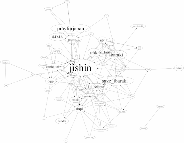 03-11 09 10 11 12 13 14 15 16 17 18 19 20 21 22 23 03-12 00 01 02 03 04 05 06 07 08 09 10 11 12 13 14 15 16 17 18 19 20 21 22 23 03-13 00 01 02 03 04 05 06 07 08 09 10 11 12 13 14 15 16 17 18 19 20 21 22 23 03-14 00 01 02 03 04 05 06 07 08 09 10 11 12 13 14 15 16 17 18 19 20 21 22 23 03-15 00 01 02 03 04 05 06 07 08 09 10 11 12 13 14 15 16 17 18 19 20 21 22 23 03-16 00 01 02 03 04 05 06 07 08 09 10 11 12 13 14 15 16 17 18 19 20 21 22 23 03-17 00 01 02 03 04 05 06 07 08 09 10 11 12 13 14 15 16 17 18 19 20 21 22 23 03-18 00 01 02 03 04 05 06 07 08 | Top > Project 311 > 2011-03-14_042011-03-14_04のハッシュタグの共起ネットワーク*各画像は縮小後の物で、元のサイズの画像にリンクされています。全体UCINET用ネットワークファイルGraphviz用ネットワークファイル ![]() リツイートなしUCINET用ネットワークファイルGraphviz用ネットワークファイル ![]() リツイートのみUCINET用ネットワークファイルGraphviz用ネットワークファイル ![]() |
