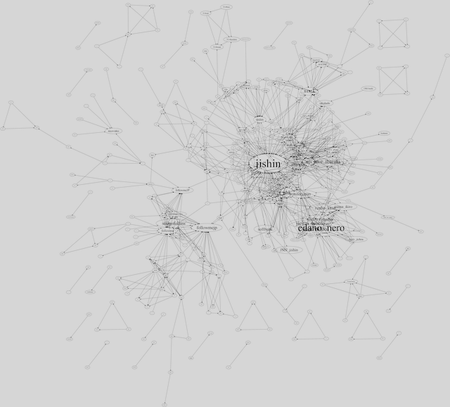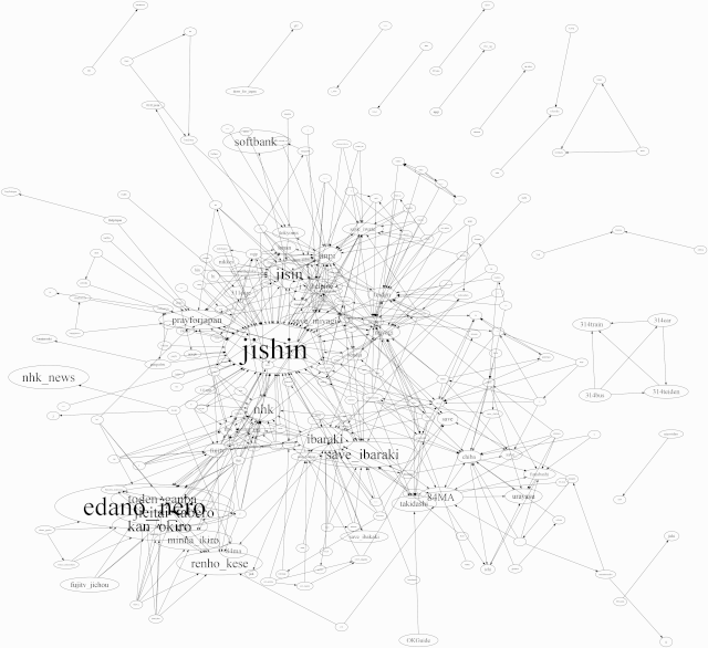 03-11 09 10 11 12 13 14 15 16 17 18 19 20 21 22 23 03-12 00 01 02 03 04 05 06 07 08 09 10 11 12 13 14 15 16 17 18 19 20 21 22 23 03-13 00 01 02 03 04 05 06 07 08 09 10 11 12 13 14 15 16 17 18 19 20 21 22 23 03-14 00 01 02 03 04 05 06 07 08 09 10 11 12 13 14 15 16 17 18 19 20 21 22 23 03-15 00 01 02 03 04 05 06 07 08 09 10 11 12 13 14 15 16 17 18 19 20 21 22 23 03-16 00 01 02 03 04 05 06 07 08 09 10 11 12 13 14 15 16 17 18 19 20 21 22 23 03-17 00 01 02 03 04 05 06 07 08 09 10 11 12 13 14 15 16 17 18 19 20 21 22 23 03-18 00 01 02 03 04 05 06 07 08 | Top > Project 311 > 2011-03-14_172011-03-14_17のハッシュタグの共起ネットワーク*各画像は縮小後の物で、元のサイズの画像にリンクされています。全体UCINET用ネットワークファイルGraphviz用ネットワークファイル ![]() リツイートなしUCINET用ネットワークファイルGraphviz用ネットワークファイル ![]() リツイートのみUCINET用ネットワークファイルGraphviz用ネットワークファイル ![]() |