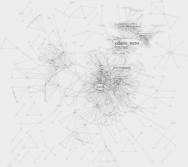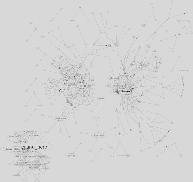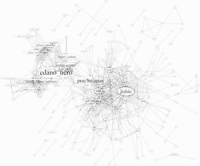 03-11 09 10 11 12 13 14 15 16 17 18 19 20 21 22 23 03-12 00 01 02 03 04 05 06 07 08 09 10 11 12 13 14 15 16 17 18 19 20 21 22 23 03-13 00 01 02 03 04 05 06 07 08 09 10 11 12 13 14 15 16 17 18 19 20 21 22 23 03-14 00 01 02 03 04 05 06 07 08 09 10 11 12 13 14 15 16 17 18 19 20 21 22 23 03-15 00 01 02 03 04 05 06 07 08 09 10 11 12 13 14 15 16 17 18 19 20 21 22 23 03-16 00 01 02 03 04 05 06 07 08 09 10 11 12 13 14 15 16 17 18 19 20 21 22 23 03-17 00 01 02 03 04 05 06 07 08 09 10 11 12 13 14 15 16 17 18 19 20 21 22 23 03-18 00 01 02 03 04 05 06 07 08 | Top > Project 311 > 2011-03-14_212011-03-14_21のハッシュタグの共起ネットワーク*各画像は縮小後の物で、元のサイズの画像にリンクされています。全体UCINET用ネットワークファイルGraphviz用ネットワークファイル ![]() リツイートなしUCINET用ネットワークファイルGraphviz用ネットワークファイル ![]() リツイートのみUCINET用ネットワークファイルGraphviz用ネットワークファイル ![]() |